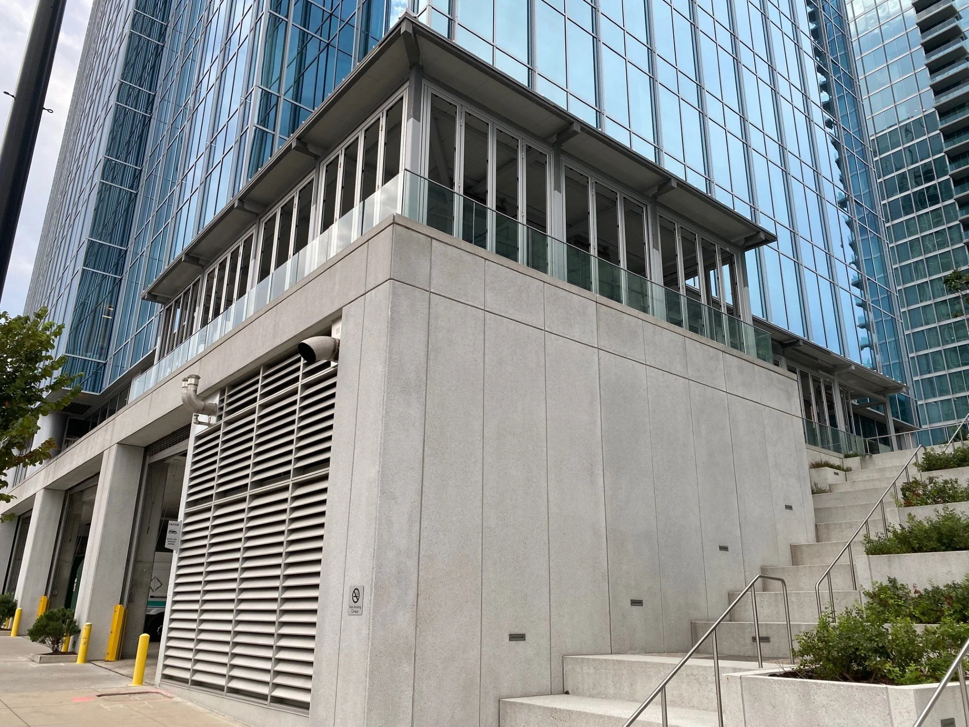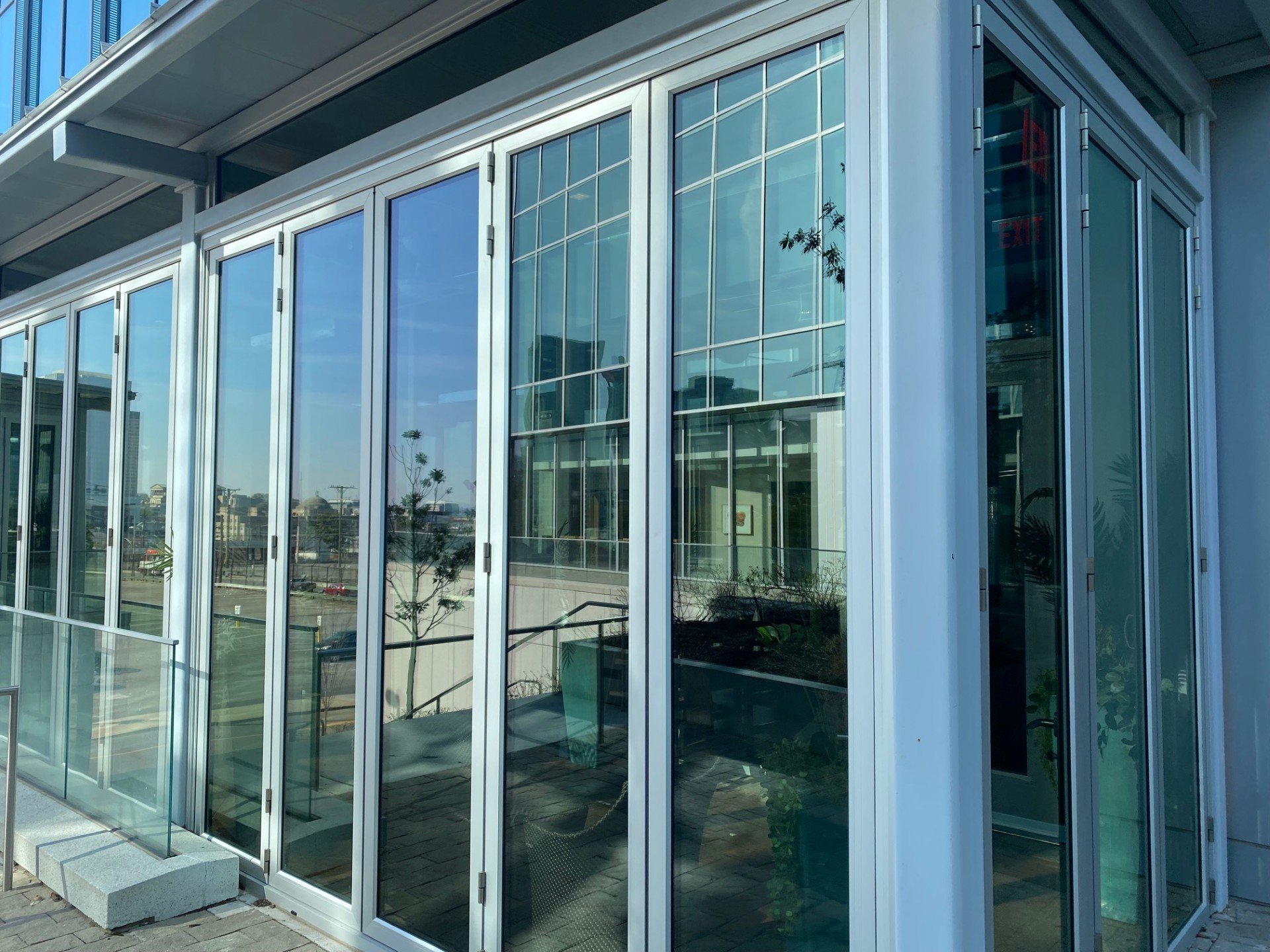 A sleek commercial space defined by light and transparency. Floor-to-ceiling glass catch doors create a seamless connection between interior and exterior, embodying modern architectural precision.